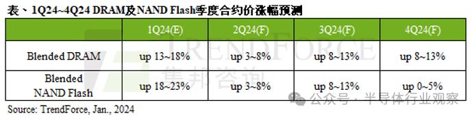 至于2024年存储芯片市况,全球市场调查机构TrendForce集邦咨询最新调查显示,DRAM产品合约价自2021年第四季开始下跌,连跌八季,至2023年第四季起涨。NAND Flash方面,合约价自2022年第三季开始下跌,连跌四季,至2023年第三季起涨。在面对2024年市场需求展望仍保守的前提下,二者价格走势均取决于供应商产能利用率情况。
