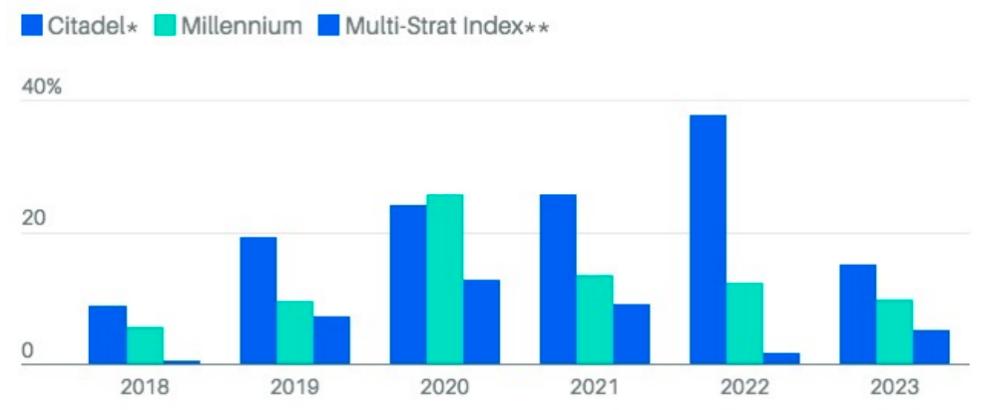 城堡投资(Citadel)创始人肯•格里芬(Ken Griffin)和他的同事们在几十个投资组合团队之间转移仓位头寸,其中一些团队寻找利率题材、大宗商品投机或量化模式等投资机会,另一些团队则做多或做空特定的个股。过去五年,城堡投资的年回报率在15%至38%之间。伊兹•英格兰德(Izzy Englander)的千禧基金(Millennium Management)同期回报率为6%至26%之间。