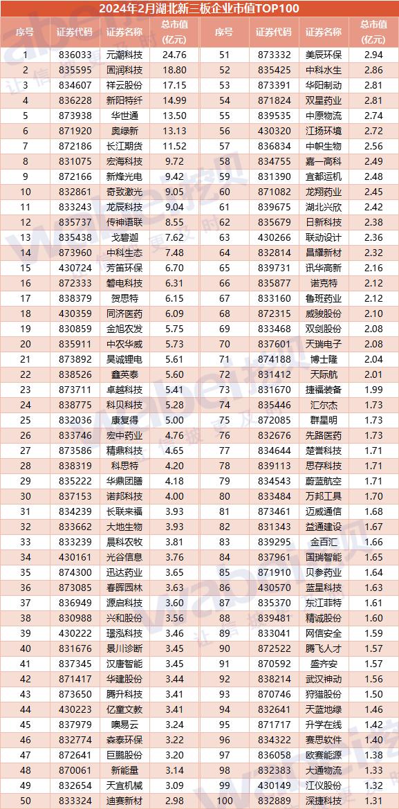 附-2024年2月湖北新三板企业市值TOP100(数据截至2月6日收盘)