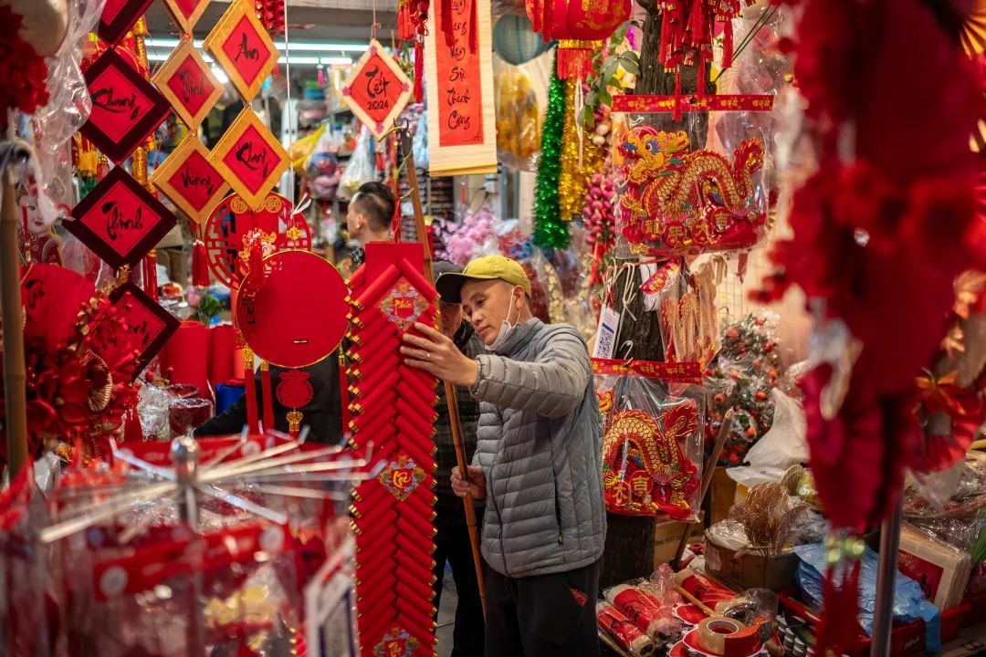 当地时间2024年2月8日,越南河内,老城区的春节集市上售卖新年装饰品。(图/视觉中国)