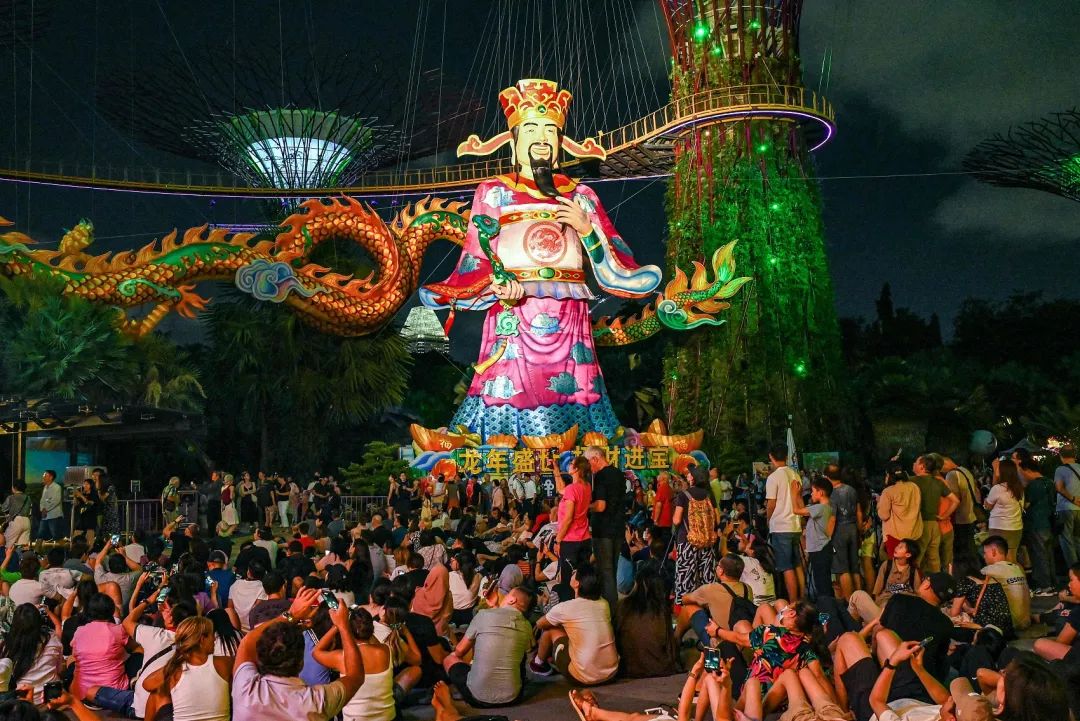 当地时间2024年2月7日,新加坡,在春节前夕,游客们在新加坡滨海湾花园的超级树天文台周围观看140米长的龙(左)和财神(中)的雕塑表演。(图/视觉中国)