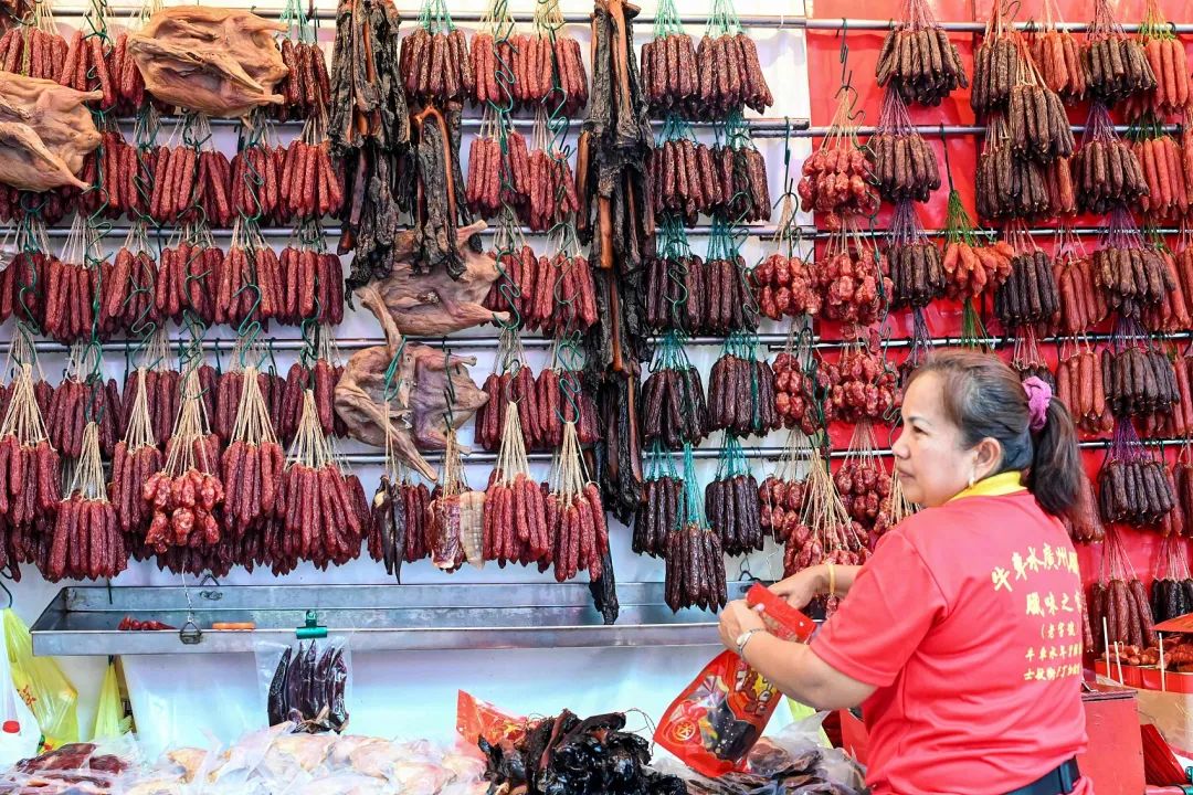 当地时间2024年1月26日,新加披,唐人街,在即将到来的中国龙年之前,一名小贩在街头摊位上准备腊肉出售。(图/视觉中国)