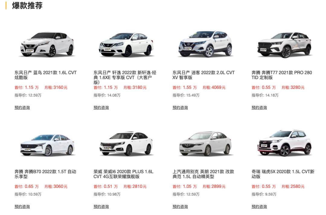 其中,直租是主打方式,用户需要支付新车的一成首付,选择36-60期月供还完,即可享用先用后付的买车服务。另外,考虑到小镇青年的用车需求和品牌偏好,花生好车的主推车型集中在售价10万元左右的经济适用车型。花生好车合作的汽车品牌包括EXEED星途、一汽奔腾、东风风神等,还有新能源车品牌零跑。