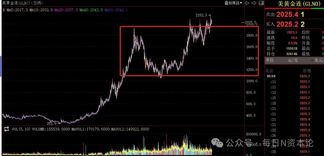 从美黄金期货K线图很容易看到,2023年2月底开始,美黄金期货开始震荡攀升,并在去年12月创出了历史新高,新的上升空间似乎已经打开。