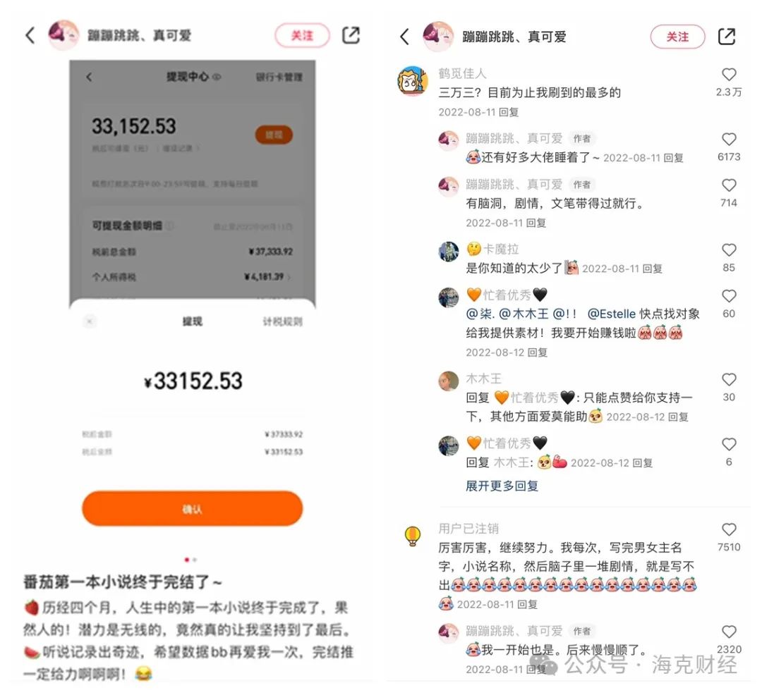 比如用户“蹦蹦跳跳真可爱”在小红书展示自己从番茄小说收获的稿费截图,称用4个月完成了人生的第一部小说,收入为3.3万元,并表示自己只是普通作者水平,还要向优秀作者学习。在笔记评论区,有大量用户表示这个收益已经相当高了,还有不少同为作者的用户推荐自己的网文。