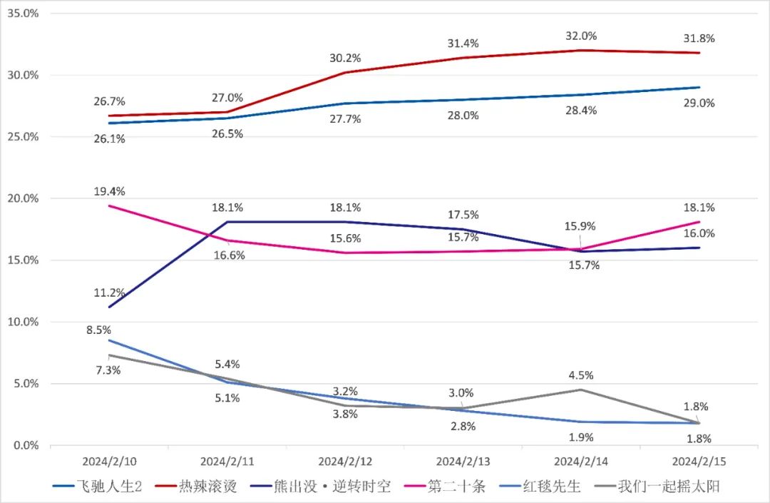 多年的春节档经验已经验证了我国春节电影市场的容量为6-7部主要影片。上映前,关于今年春节档六部影片竞争格局的猜测层出不穷。而预售排片以及实际票房占比与排片占比都反映出今年春节档的双头格局:《热辣滚烫》与《飞驰人生2》属于第一梯队,票房与排片占比在30%左右;《熊出没·逆转时空》与《第二十条》属于第二梯队;《红毯先生》、《我们一起摇太阳》属于第三梯队。第一梯队中,《热辣滚烫》跑赢《飞驰人生2》。