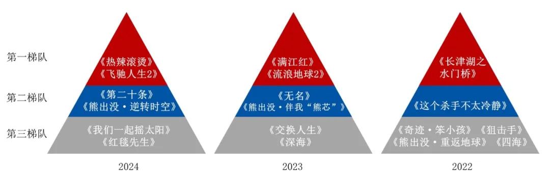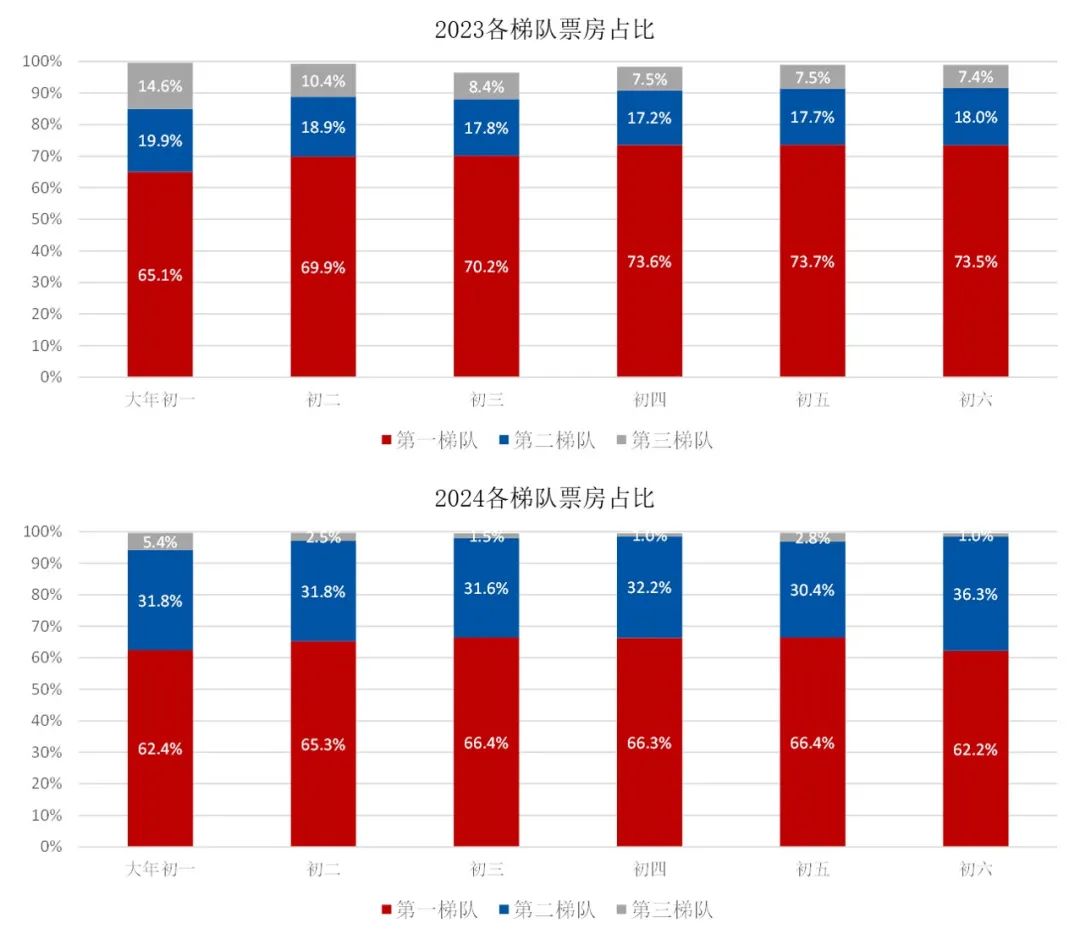 图62024年第一梯队票房占比下降,第二梯队占比大幅上升