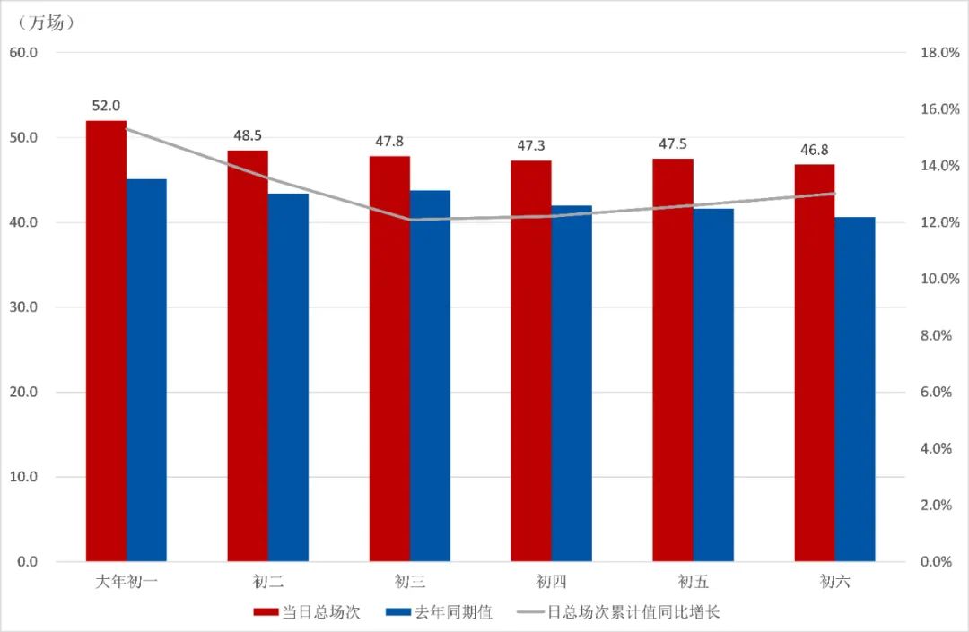 与往年不同的是,今年的春节假期放假时间为大年初一至大年初八,这便意味着今年的春节档电影比往年多了两天的冲刺期。因此,使用整个春季档的票房与往年对比,是无法准确刻画春节档电影市场实际表现的。由此,我们着重对大年初一至大年初六这六天的电影市场进行分析。