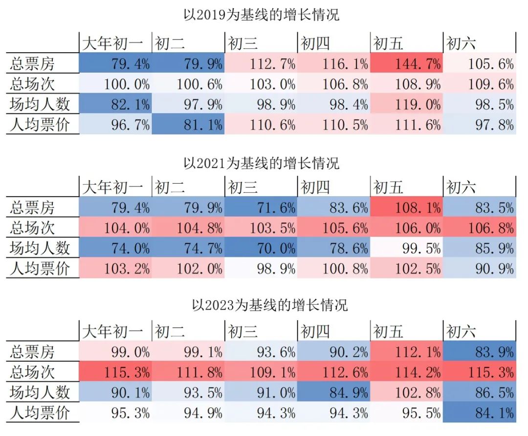 采用2019、2021、2023三个节点作为基准比较2024年春节档电影市场的增长情况;其中前两个节点分别代表疫情前以及春节档票房历史最高点。通过将电影市场总票房拆解为总场次、场均人数、人均票价三个乘数,考察总票房与各乘数较基线的增减。