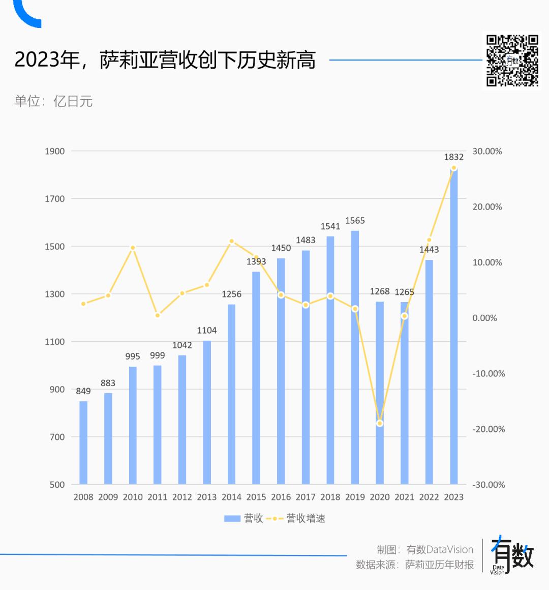 不仅受消费者追捧,贵为“麦门”并驾齐驱的新流派“萨门”,还赚得盆满钵满。2023财年,萨莉亚营收同比增长27%至89亿人民币,3.6亿的营业利润是前一年的17倍;其中,几乎8成都是中国贡献的[3]。