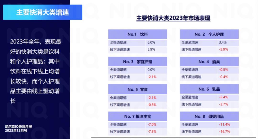 2023年,主要快消大类,除了饮料和个护,基本都是负增长,而线下渠道也只有饮料在增长。