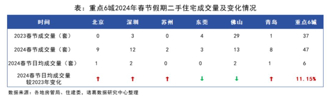 除东莞、佛山出现下滑外,其余4城日均成交量均较2023年有小幅增加,其中北京、苏州二手住宅成交量由去年春节“0”网签分别上升至9套、2套,深圳、青岛也有较大幅度上升。