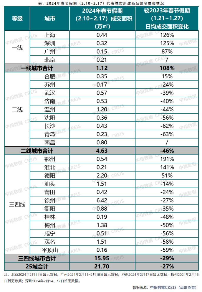 中指研究院数据显示,2024年春节假期,25个代表城市新房日均成交面积较上年春节假期(2023年1月21日至1月27日)下降约27%。
