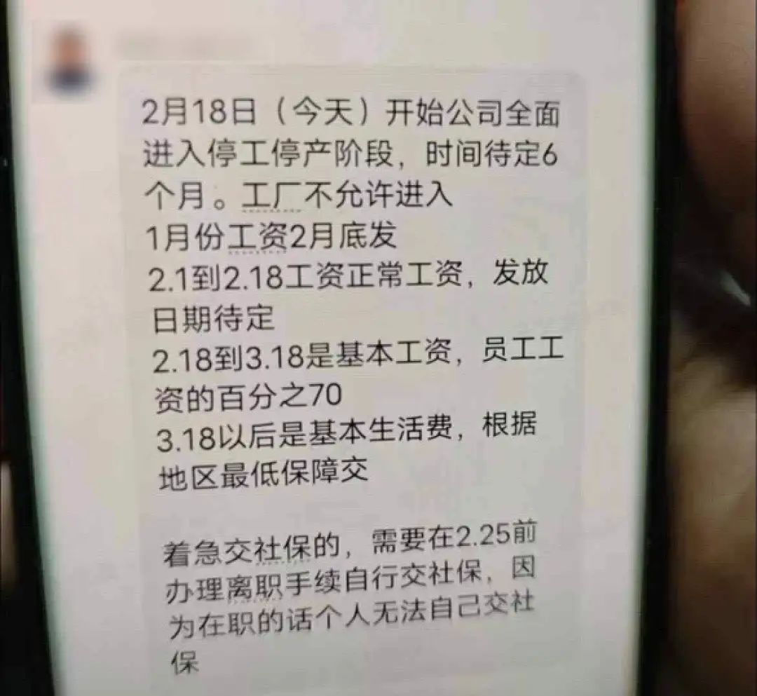 1月底工资2月底发;2.2到2.18正常工资,发放日期待定;2.18~3.18全额工资的70%;3.18以后,根据地区最低保障交,每个月2690元。