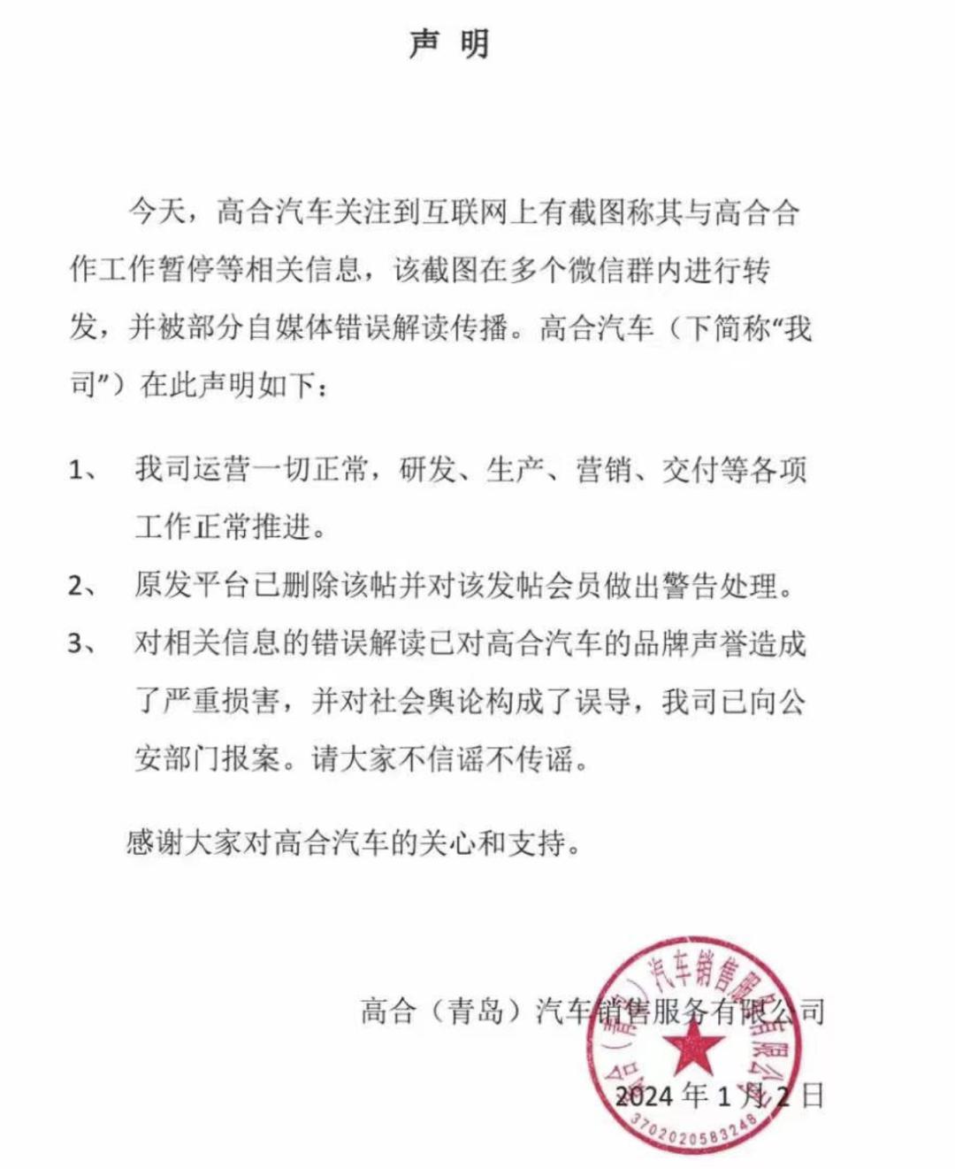 1月2日,高合汽车内部有关停止所有工作的消息开始流传,包括暂停发货、停止新项目开发,并准备法律诉讼。对此高合发布紧急声明,称这些不实信息已对品牌造成严重损害,公司已报案。