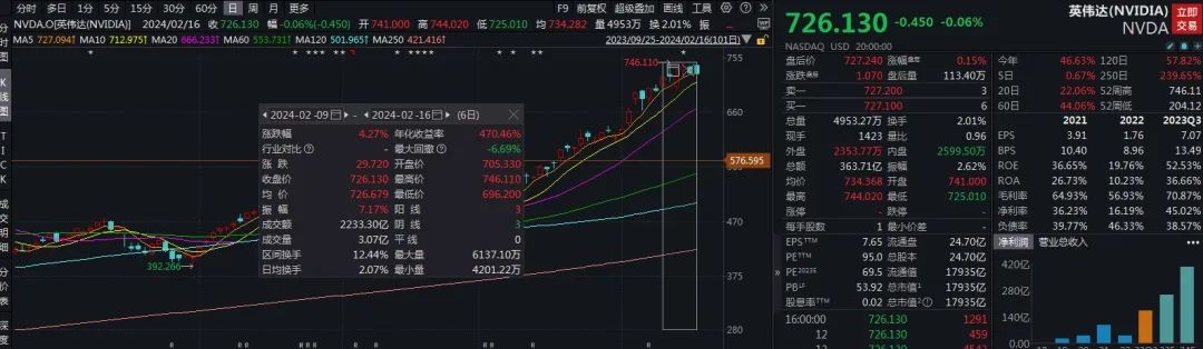 这期间,英伟达股价微涨,截至美股2月16日收盘,英伟达报726.130美元/股,总市值为1.79万亿美元,跑赢了谷歌和亚马逊,坐上美股第三把交椅。