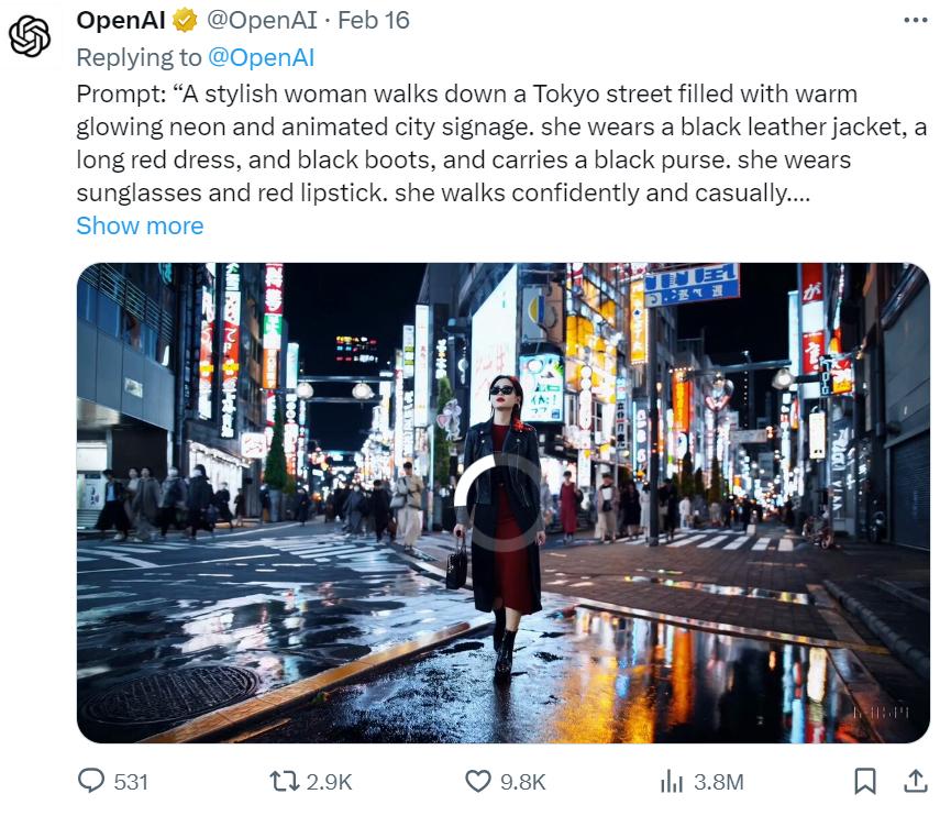 2月16日,微软投资的OpenAI发布了首个文生视频模型Sora。据介绍,Sora可以根据文本指令,直接输出长达60秒的视频。视频包括高清晰度的场景、复杂的镜头动作,并可支持多个角色的创作。从OpenAI在社交媒体上发布了数十条9秒到60秒长度不等的视频样片来看,效果或不输于此前备受追捧的Runway和Pika等AI视频创业公司。这也意味着,继文本、图像之后,OpenAI将其先进的AI技术拓展到了视频领域。