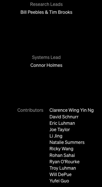 Sora 团队整体非常年轻。核心成员有三位,分别是研究负责人Bill Peebles(比尔·皮布尔斯)与 Tim Brooks(蒂姆·布鲁克斯)与系统主管 Connor Holmes。
