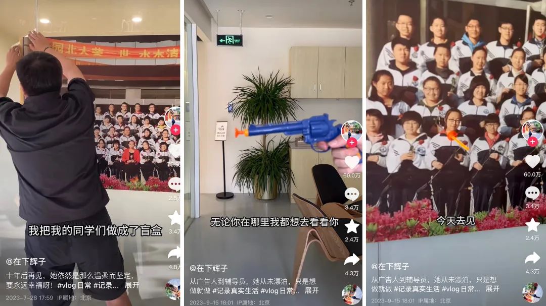 @在下辉子 “把老同学做成盲盒” ,每期视频都会随机选取毕业照上的一名老同学,而后去实地探访并记录下他们毕业十年后的生活现状。这种仿佛开启人生盲盒的内容形式让观众在窥见人生的更多可能之时,也触发了他们对于时间、选择、心态、人生等问题的多重思考。借助“老同学盲盒”系列内容,@在下辉子仅用三个月时间就涨粉400W。