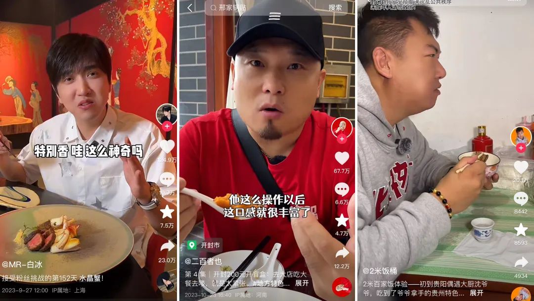 二是以@ MR-白冰、@二百者也、@2米饭桶、@牛哥不牛 等为代表的探店类账号,这类内容通过不同的玩法和形式,为用户展现并种草了各色美食,如@ MR-白冰主打奢华探店、@二百者也 主打定额盲盒探店、@2米饭桶 则主打尝遍百家饭,在带来新鲜感之余,也给用户带来了热烈的陪伴感。