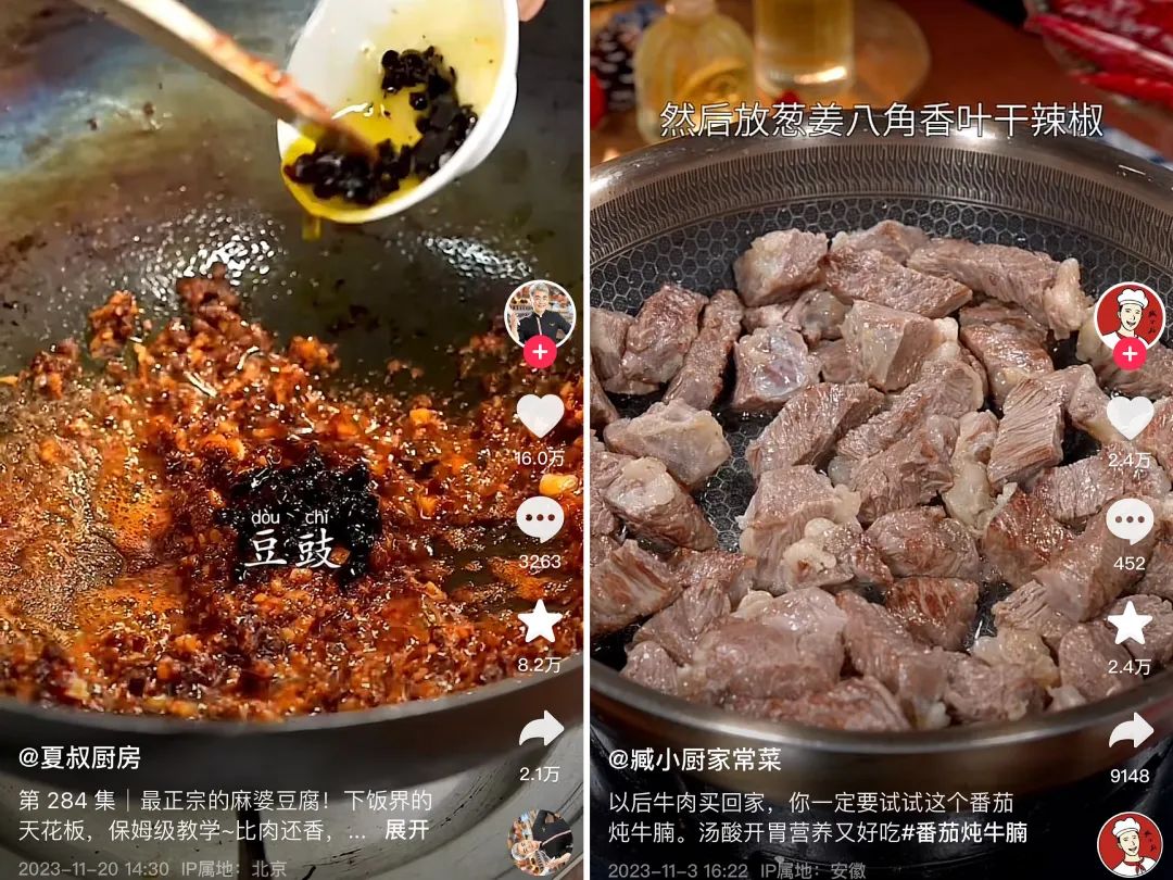 这三种内容之外,常规的美食教程账号@夏叔厨房、@臧小厨家常菜 等同样占据着一定的份额。这类账号在内容呈现上不强调过多的形式和花样,而是力求通过清晰的画面和简洁明了的讲解直观向用户展现出各种家常美食的制作过程,核心是满足了用户的实用需求。
