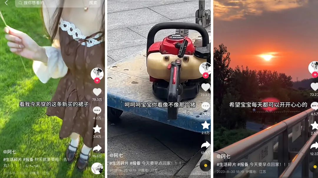 再比如声优怪物@阿七,会在视频中事无巨细地向用户报备自己的生活碎片。第一视角下各种琐碎真实的生活画面呈现搭配阿七得天独厚的配音技能,让这些作品兼具了私密性和亲密性。用户在观看视频时,仿佛在看自己甜美可爱、又会撒娇撩人的完美女友单独发来的生活分享,在交互感强烈的观赏体验中,很容易与账号主人公产生浓厚的情感联结,这无疑有效带动了账号的增粉速度。