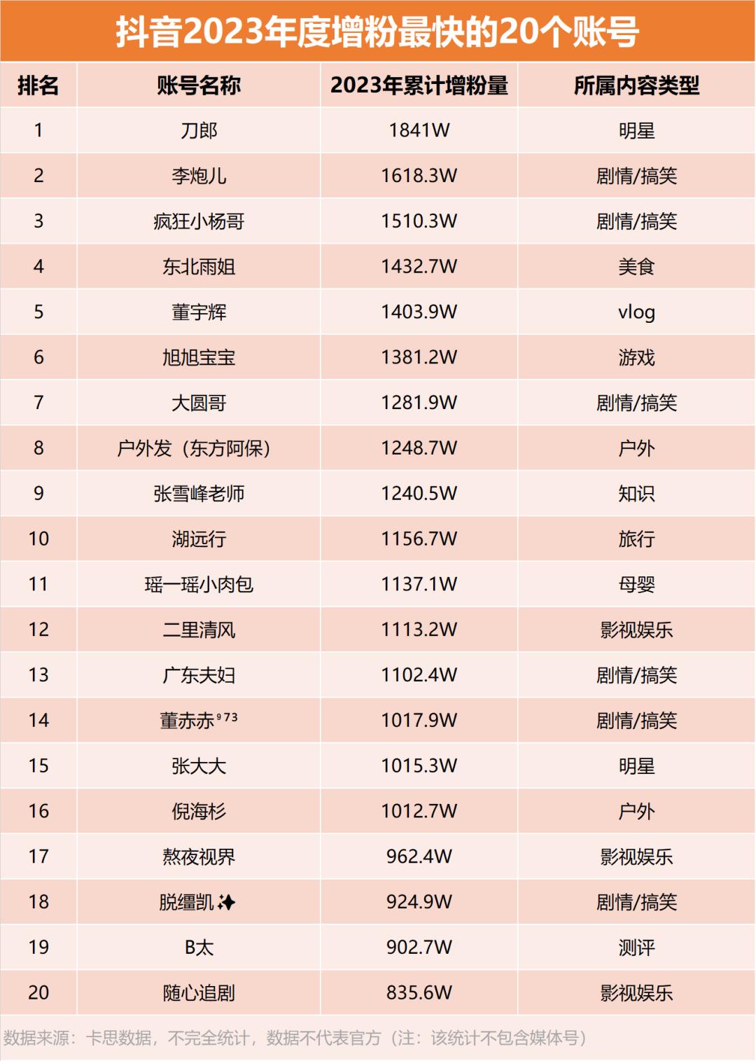 为了解答这些问题,卡思数据统计出了2023年一整年增粉最快的1000个账号,并从数据维度、内容维度出发,以更为广阔的视角,让大家对2023年的抖音内容产生更为清晰、直观的认知。(注:以下数据来源为卡思数据,不代表官方)
