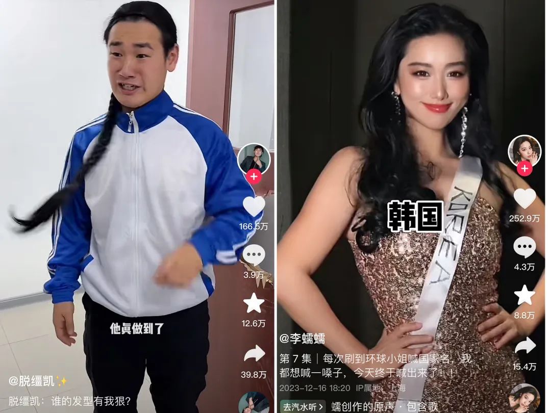 值得一提的是,2023年,一人分饰多角的创作模式在整个剧情赛道中明显占据着极高比例,不少账号如@脱缰凯、@李蠕蠕、@丁郑美子、@二阳咂 等账号都凭借这种模式脱颖而出,尤其是@脱缰凯,凭借精湛的演技和搞笑的设定,2023年共吸粉924.9W;模仿达人@李蠕蠕凭借“TVB腔”出圈后,又凭销冠系列短视频爆火,其后又因为模仿各国环球小姐呐喊,关注度再度攀升,甚至引起了“环球小姐”主办方的关注。