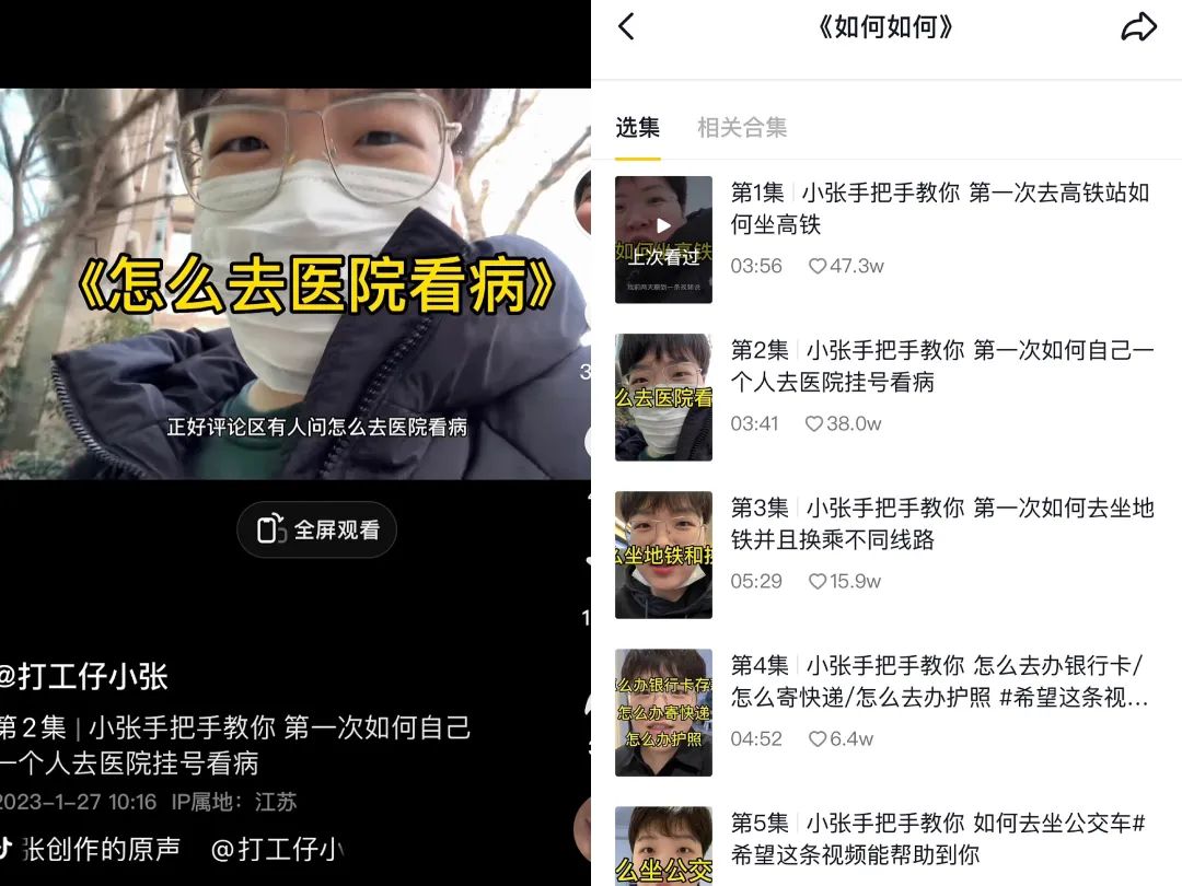 @打工仔小张,凭借着沉浸式科普日常生活中那些看似不起眼的小常识,如“如何一个人去医院挂号”“如何坐高铁”“如何去办护照”等,迅速击中了一批初入社会、初入城市生活以及社恐用户的惶恐之心,不少网友将其戏称为“社会生存学顶流”;