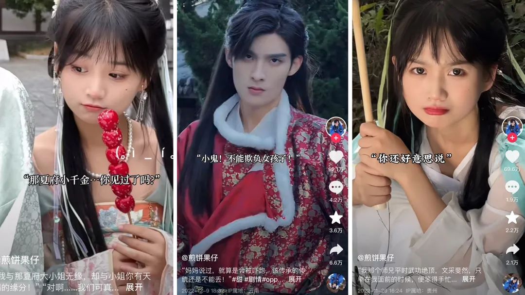● 注重场景、服化道、创意、视觉观赏性的精致派剧情,这种内容模式下既涌现出了@大圆哥 这种将生活细节戏剧化、电影化的黑马账号,也涌现出了@煎饼果仔 这样不论是服化道,还是剧情、剧情、剪辑、演技都“不逊色于电视剧”的精致短剧账号。
