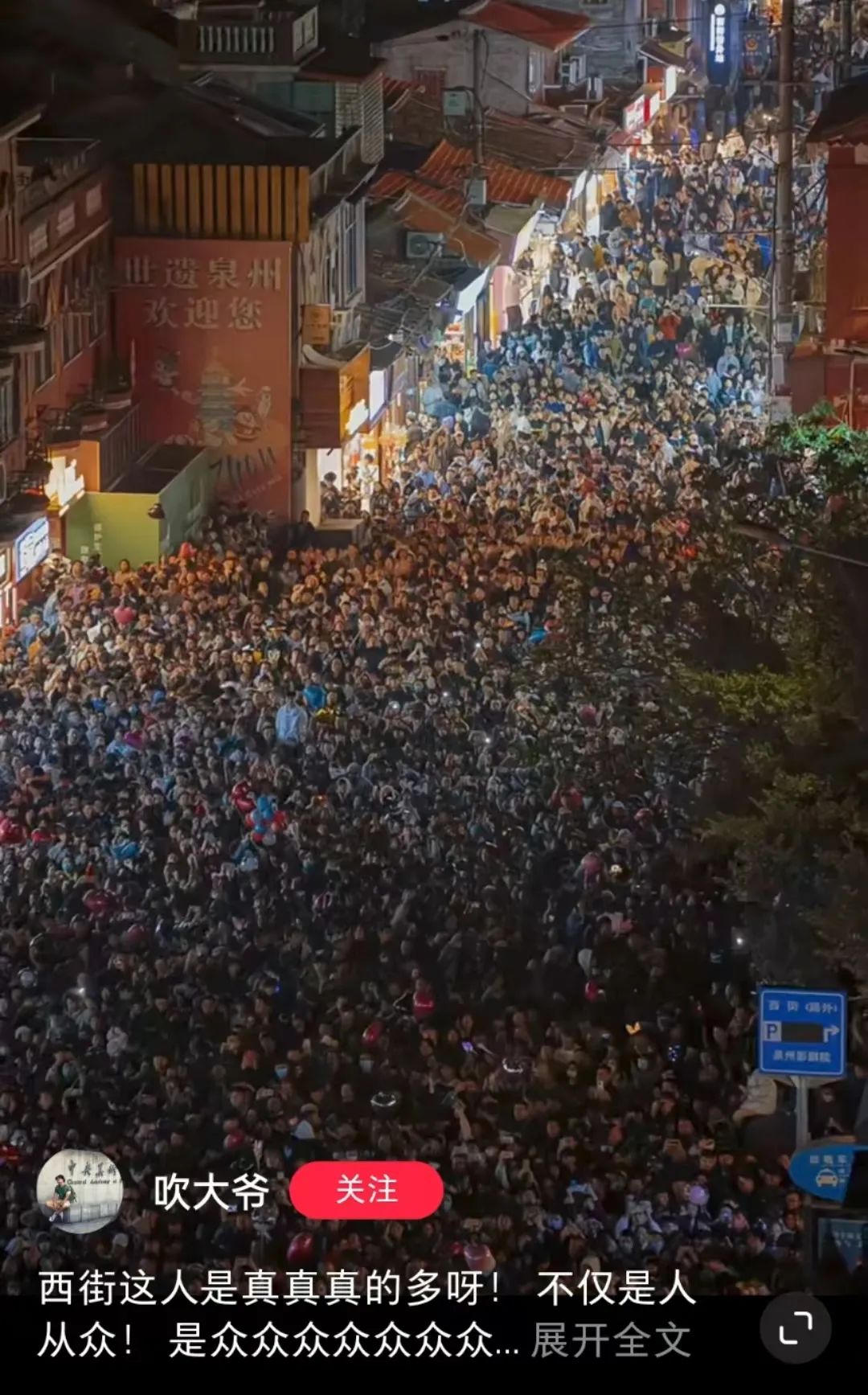 泉州当地热门景点“开元寺—西街”一带人流爆满,水泄不通。正月初二,王女士自驾游到泉州,本想吃顿饭玩一玩再赶路,但是美食一条街的西街只给她拍张照打道回府的机会。身材比较娇小的小林也做了去西街玩的攻略,她一早上直接到了西街,但挤进去后难出来。