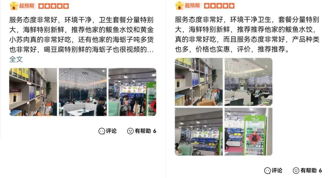 “我给您抹个零头,方便帮忙点评一下吗?”店员询问。内参君答应当下,手机已被店员拿走,只见其熟练地拍了几张店内图,并做了关于服务、环境、分量等维度的评价。还不忘在发布间隙给做买单结算、迎接新进门的顾客……操作动作可以用“行云流水”来形容。而在线上评论区,内参君看到了“类似语气”的评论。