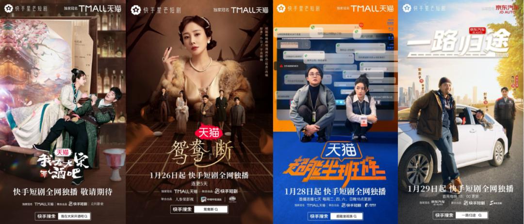 明星效应在快手则体现得更加显著,6部春节档短剧中有4部由明星参演,其中与天猫合作的三部明星短剧《我在大宋开酒吧》《鸳鸯断》《超能坐班族》集结了张晓龙、斓曦、李纯、尹正、郭晓婷等一众长剧“熟脸”;京东汽车与快手合作的明星短剧《一路归途》则请来了宋木子和乔杉。然而相比抖音,快手春节前后上线的短剧整体热度表现都算不上强势,不过在商业收益上尚可博一博。