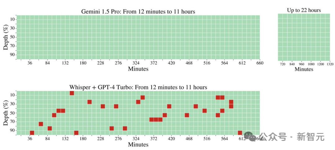 在音频处理方面,Gemini 1.5 Pro能够在大约11小时的音频资料中,100%成功检索到各种隐藏的音频片段。