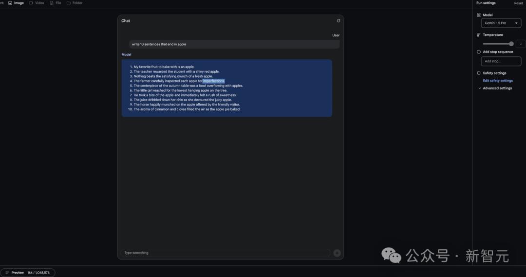 他又让Gemini 1.5造10个句子,每个句子都以「Apple」结尾。