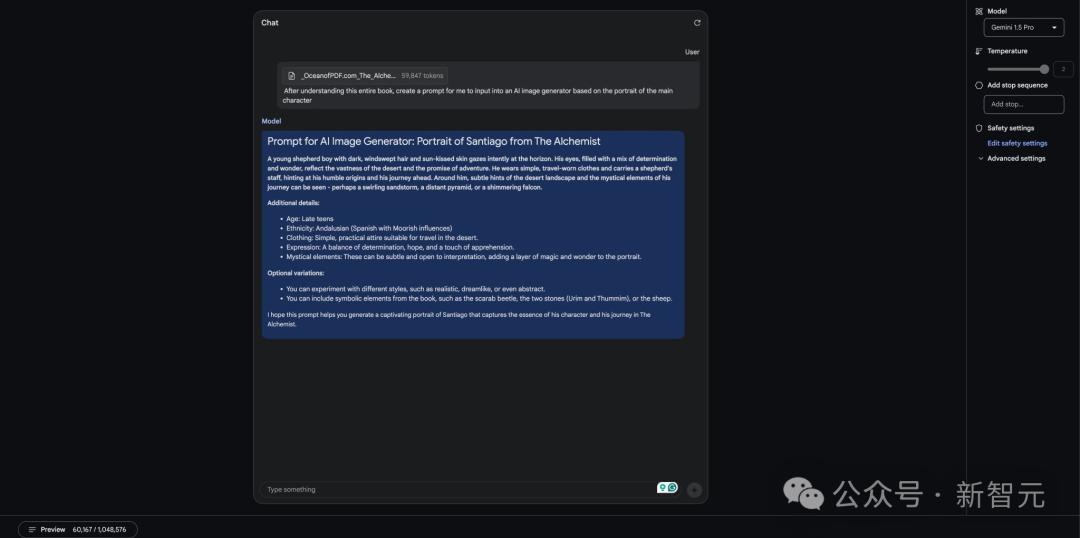 他又把《炼金术士》这本书的PDF全文输入到了Gemini 1.5中,目的是获取书中主人公的形象描述。