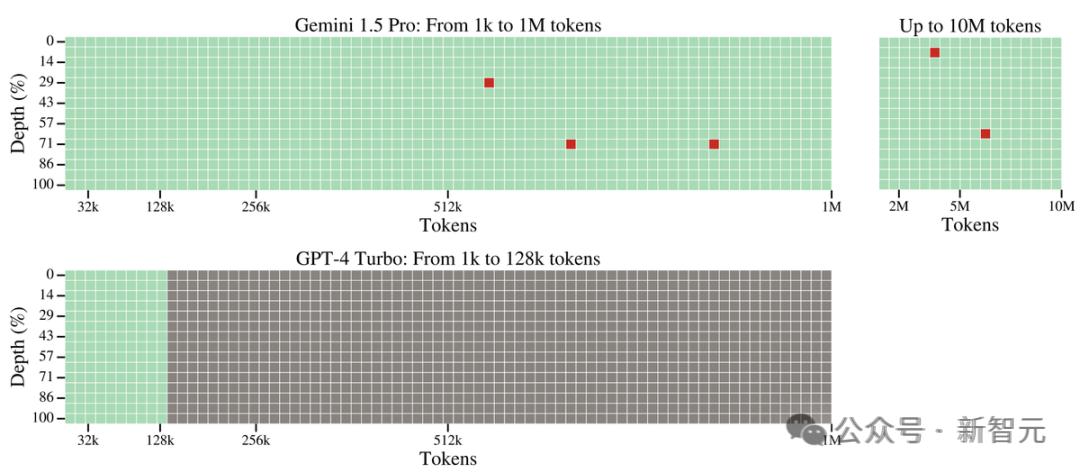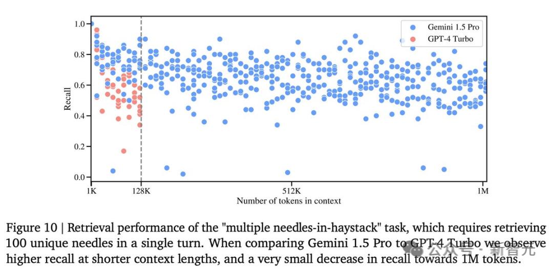 在这个测试中,Gemini 1.5 Pro在较短的文本长度上的性能超过了GPT-4-Turbo,并且在整个100万token的范围内保持了相对稳定的表现
