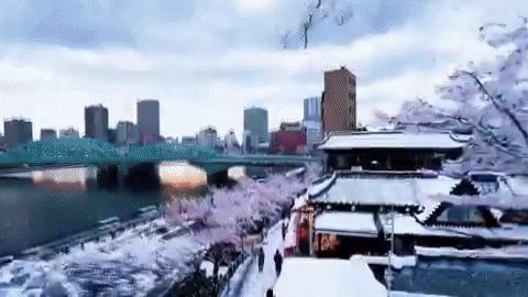 首先,尽管雪下得非常大,樱花却依然绽放。通常,樱花在春季开放,那时天气温暖,不会有雪。