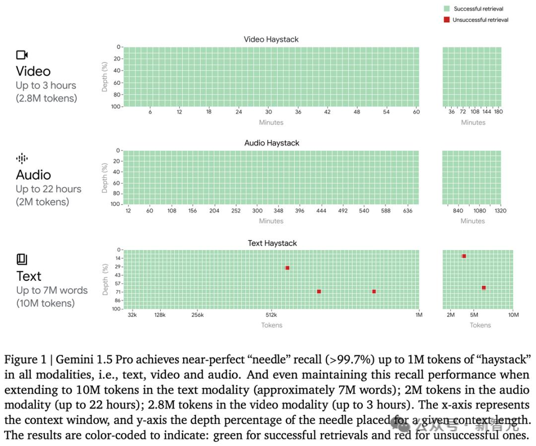 对于文本处理,Gemini 1.5 Pro在处理高达530,000 token的文本时,能够实现100%的检索完整性,在处理100万token的文本时达到99.7%的检索完整性。