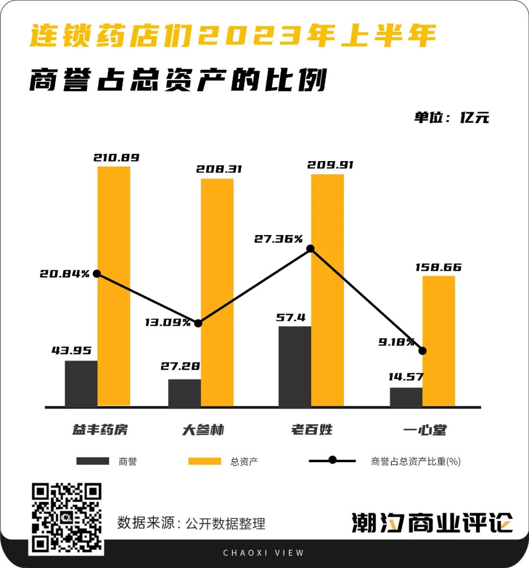 最后是急速扩张带来的高悬商誉。 截至2023年上半年,益丰药房、大参林、老百姓、一心堂四家药店连锁企业的商誉分别为43.95亿元、27.28亿元、57.4亿元、14.57亿元,商誉占总资产的比例分别为20.84%、13.09%、27.36%、9.18%。
