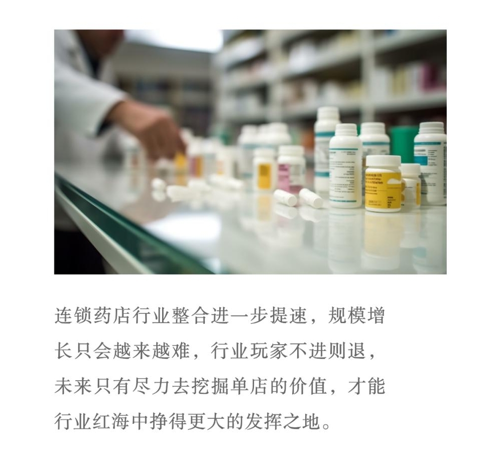 随着 "医药分开" 综合配套改革措施的推进,越来越多的处方药品开始外流,连锁药店行业整合进一步提速,规模增长只会越来越难,行业玩家不进则退,未来只有尽力去挖掘单店的价值,才能行业红海中挣得更大的发挥之地。