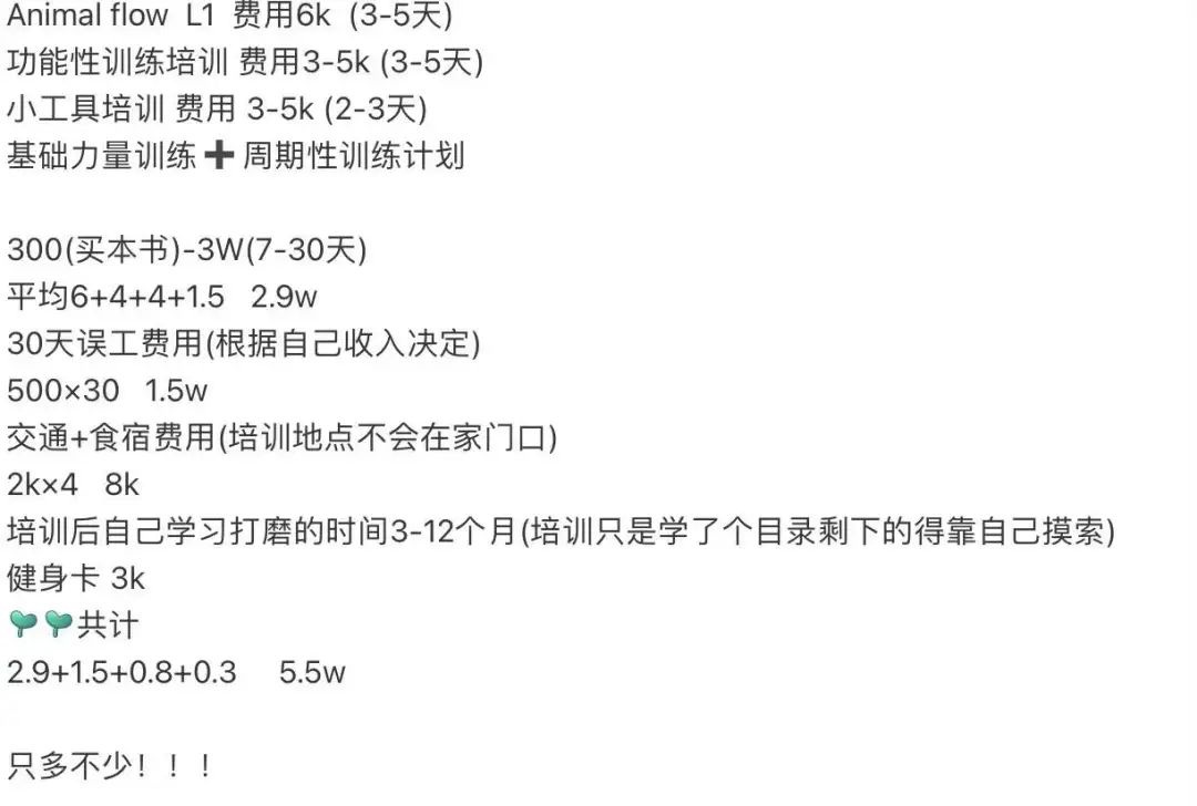 训练费用更不必说,贾玲的健身教练肯定不止一个,健身不同阶段术业有专攻,力量的、动物流的应该都是专人教练,甚至到后期为了维持体脂率专门负责脱水的、饮食控制的,也需要专人负责。