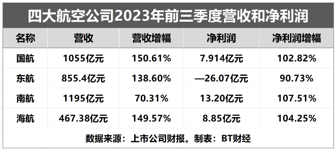 国航在2023年前三季度总营收1055亿元,同比增长150.61%;净利润7.914亿元,同比增长102.82%。东航同期营收855.4亿元,同比增长138.60%;净利润为-26.07亿元,同比增长90.73%。南航同期营收为1195亿元,为四大航空集团营收最高的一家,同比增长70.31%;净利润13.20亿元,同比增长107.51%。海南航空的实力稍弱,同期营收467.38亿元,同比增长149.57%;净利润8.85亿元,同比增长104.25%。