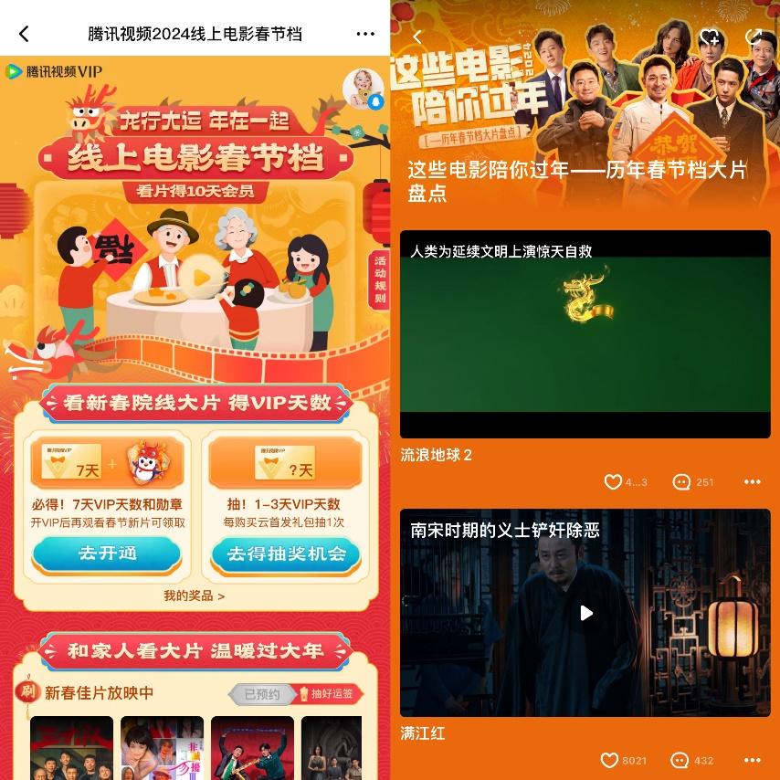 除了短期收获的流量与分账之外,“爱优腾”更想要的还是能够带来长期利益的会员用户增长。以腾讯视频为例,其推出了“看新春院线大片,得VIP天数”的活动,即开通腾讯视频VIP观看任意新春院线大片,就能够额外获得7天会员,腾讯视频希望借此拉动会员增长。