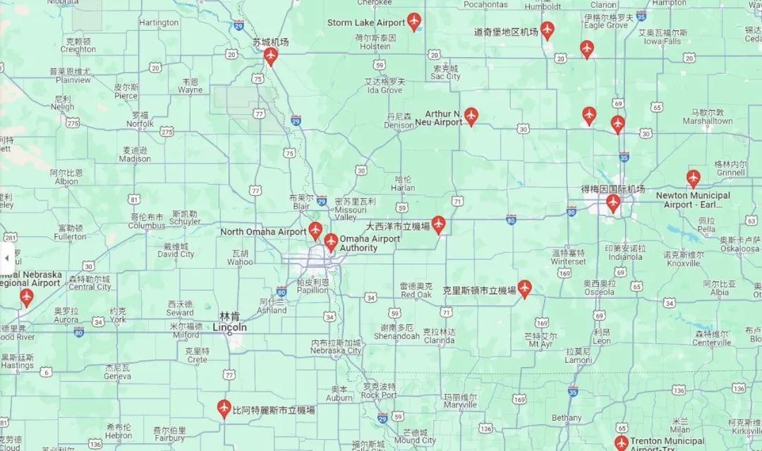 而且这么小的一个城市,不仅有自己的大型民航机场,还有好几座可以起降私人小飞机的小机场。不仅奥马哈如此,它附近的几座类似小城市也都有很发达的民航体系。要飞往奥马哈这样的小城市,通常没有直飞航线,一般需要在亚特兰大、丹佛、达拉斯等其他航空枢纽中专一道,然而经过这些航空枢纽中转,你就可以从奥马哈飞往全世界大部分地区,非常方便。
