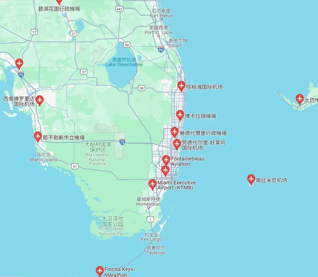有网友在卫星地图上数了一下,以美国佛罗里达州迈阿密周边地区(面积相当于上海 的70%面积)为例,这么小的一片区域内居然分布着大小10座机场,所以这里的航空运力就没有那么紧张,也没有很迫切需要修建高铁。