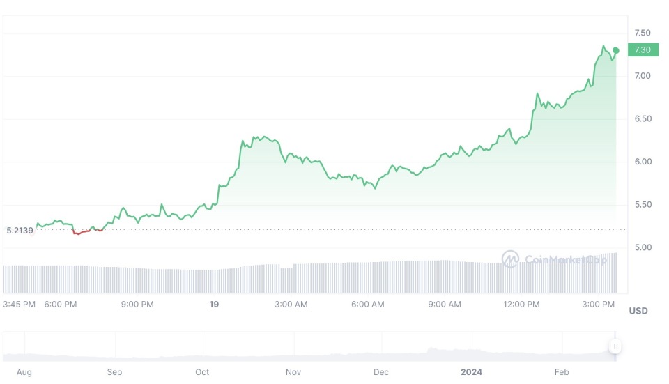 加密货币市场数据网站CoinMarketCap提供的数据显示,至发稿时,Worldcoin的价格已升至7.3美元,较一周以前2.5美元的价格激增192%。按照当前的价格计算,世界币的总市值已达9.6亿美元。此外,世界币在2月18日还通过社交媒体X宣布迎来新里程碑,旗下首个钱包World App的日活用户数量突破100万。