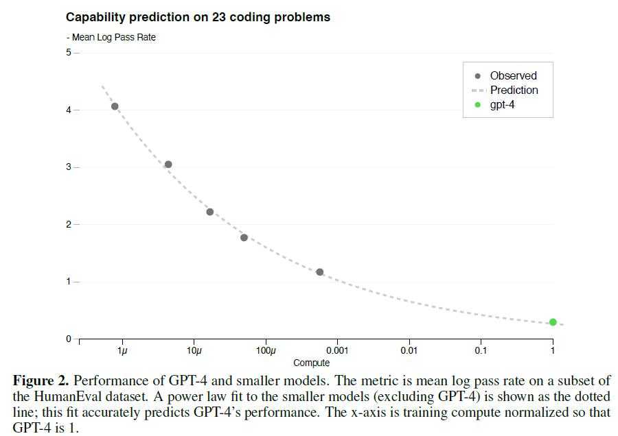 简单翻译一下,GPT-4在这23个问题上的性能预测,可以通过比GPT-4小1000倍的模型预测得来。也就是说GPT-4还没开始训练,它在这23个问题上的性能就已经知道了。
