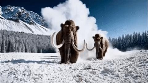 “几只巨大的、毛茸茸的猛犸象,踩着白雪皑皑的地面走近,风吹动它们身上的长长毛发,远处是白雪覆盖的高大树木和雄伟山脉,午后的光线营造出温暖的光芒。”