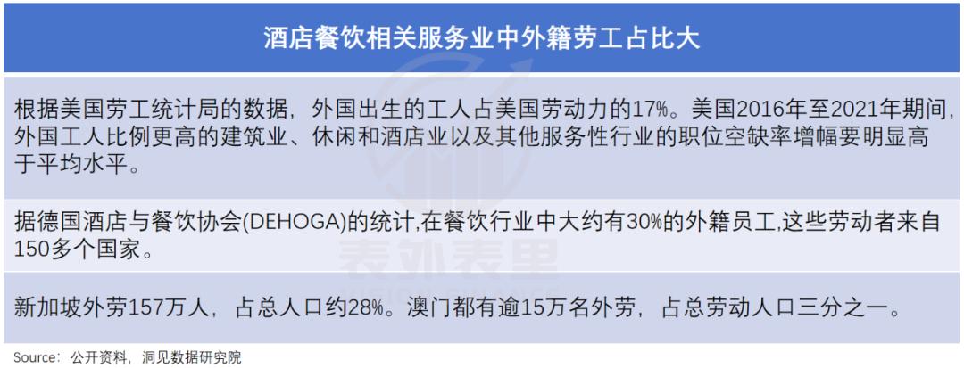 可以看到,欧美、新加坡等很多热门旅游地区,酒店、餐饮等服务业,外籍劳工占比很大——中国澳门的外籍劳工占总劳动人口的三分之一;英国的欧盟劳工占比高达70%。